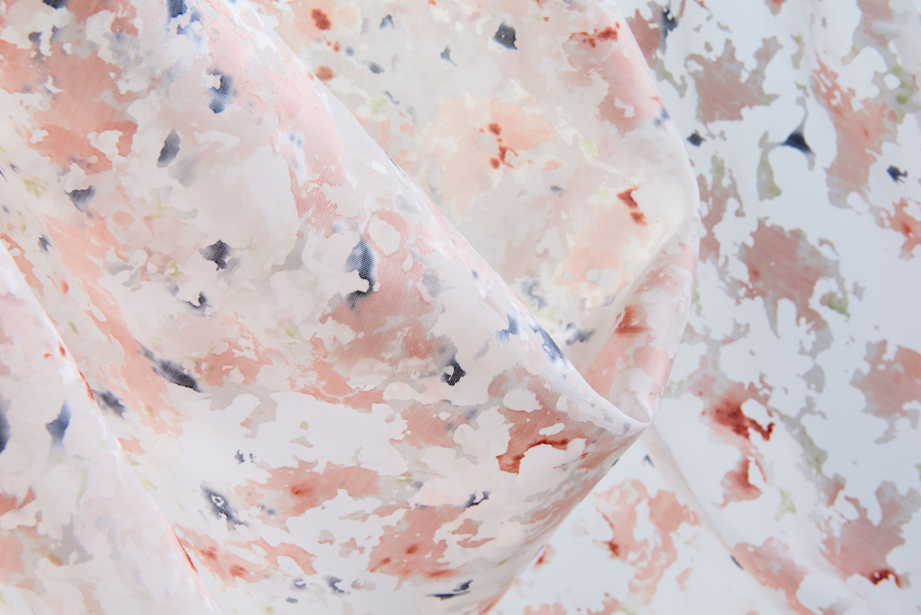 Using a natural sponge for printing allowed to achieve a rhythmic dotted surface. The half-transparent Devoré gives the room an airy atmosphere. It filters incoming light and also protects the privacy.